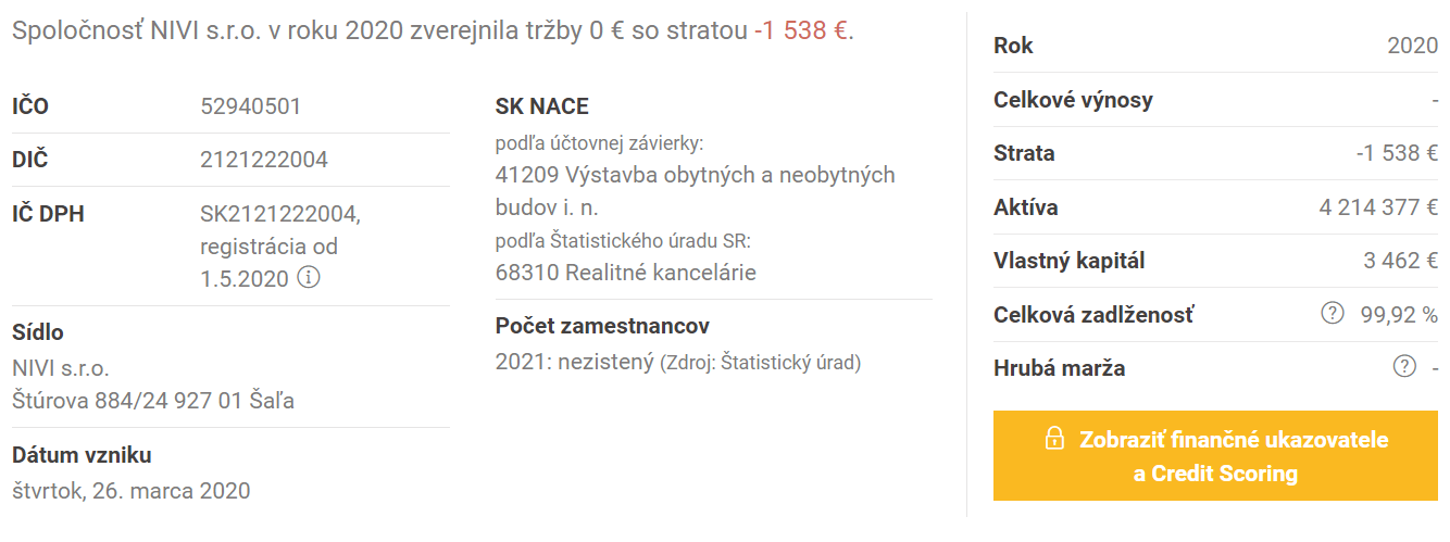 Ak čakáš, že za týmto projektom bude stáť veľký developer ako je napríklad HB Reavis, Penta alebo JTRE, si na omyle. Zákazku získala spoločnosť NIVI s.r.o. so sídlom v Šali, ktorá bola založená iba 26. marca 2020. Podľa portálu Finstat spoločnosť zverejnila v roku 2020 nulové tržby so stratou 1 538 eur. Celková zadlženosť firmy v roku 2020 predstavovala 99,92 percenta.