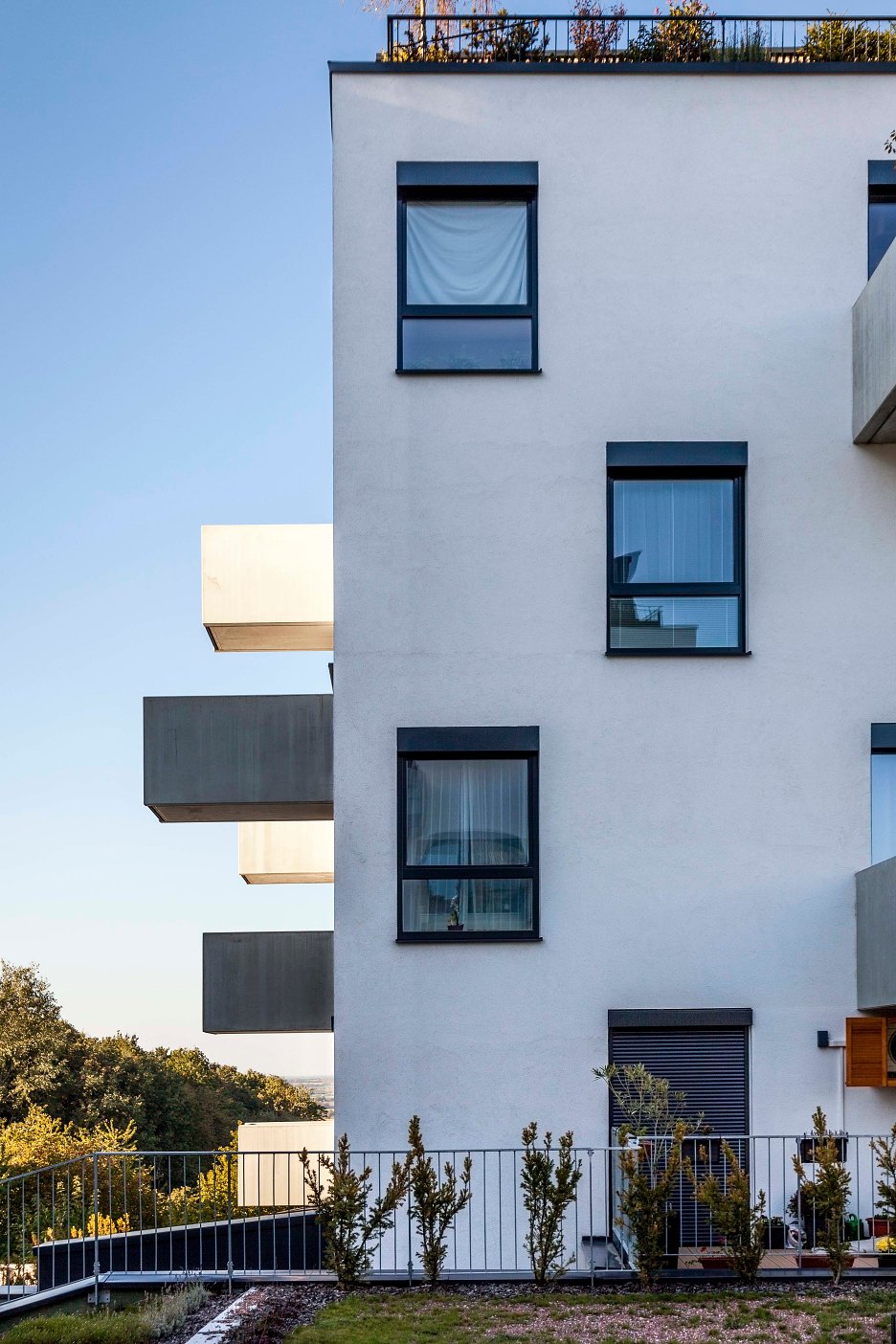 Z bytov sú cez francúzske okná prístupné vykonzolované balkóny. Spodná betónová doska odlievaná na stavbe je doplnená o prefabrikované betónové bočnice. Čelá balkónov uzatvára sklenené zábradlie, ktoré umožňuje nerušený výhľad do spoločného priestoru a krajiny.