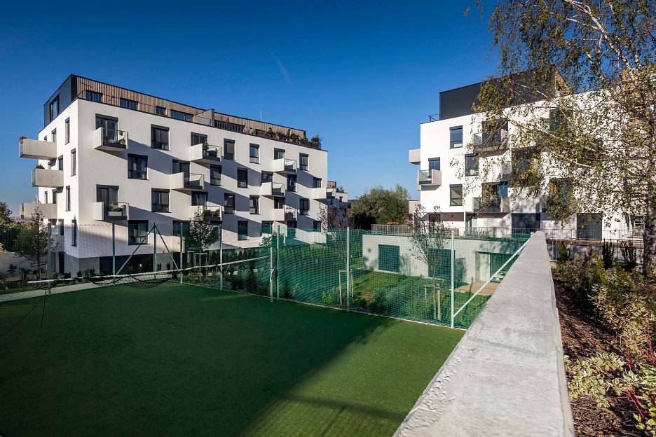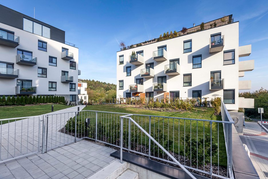 Na zapustenej podnoži s parkovaním vznikol verejný priestor prepojený zelenými plochami. Akcentom objektov sú štíhle betónové konzoly balkónov. Na projekte zreteľne cítiť ruku gramotných architektov. Zaujme racionálne a logické usporiadanie hmôt a priestorov, aj elegantná a čistá forma samotných domov.