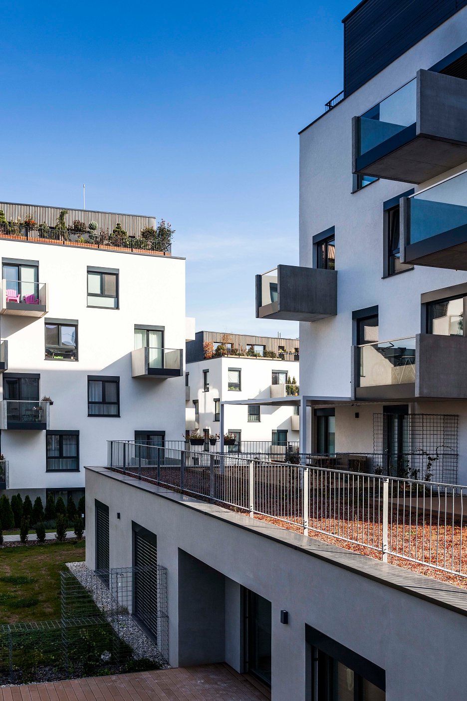 Kompaktné objekty s nepravidelným lichobežníkovým pôdorysom sú vizuálne členené na tri horizontálne úrovne. Betónová fasádna stierka oddeľuje byty na prízemí s predzáhradkami od dominantnej fasády typických podlaží. Šachovnicový raster fasády s vykonzolovanými telesami balkónov ukončuje na najvyššom podlaží materiálovo odlíšená nadstavba s penthousmi. “Po dodržaní predpísaných vertikálnych a horizontálnych požiarnych pásov sme okná na šachovnicovej fasáde opticky zvýšili priznaným nadokenným kastlíkom pre žalúzie vo farbe rámu,” dodávajú autori. V celom komplexe sú použité plastové okná Slovaktual PASIV CL s hliníkovým klipom a izolačným trojsklom (Ug = 0,6 W/m2). Okná sú z interiérovej strany biele a z exteriéru vo farbe RAL 7016 – zladené s farbou žalúzií, kastlíka aj s farbou vchodových dverí.