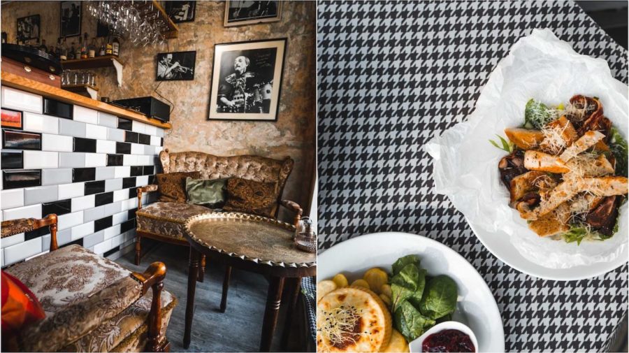 Po otvorení dverí budú vaše prvé kroky smerovať do kaviarenskej časti – mohutné historické kreslá, barový pult, na stenách zábery miestneho fotografického klubu a všade prítomné hudobné detaily, ako spomínaný gramofón vo výklade, nástroje na stenách či bubny visiace zo stropu. Už prvý pohľad nahovára, že umenie tu má svoje miesto – druhý, ten na tanier, to potvrdzuje. Táto časť podniku láka na šálku kávy či pohár vína pred koncertom, ktoré sa tu pravidelne, niekoľkokrát mesačne konajú.