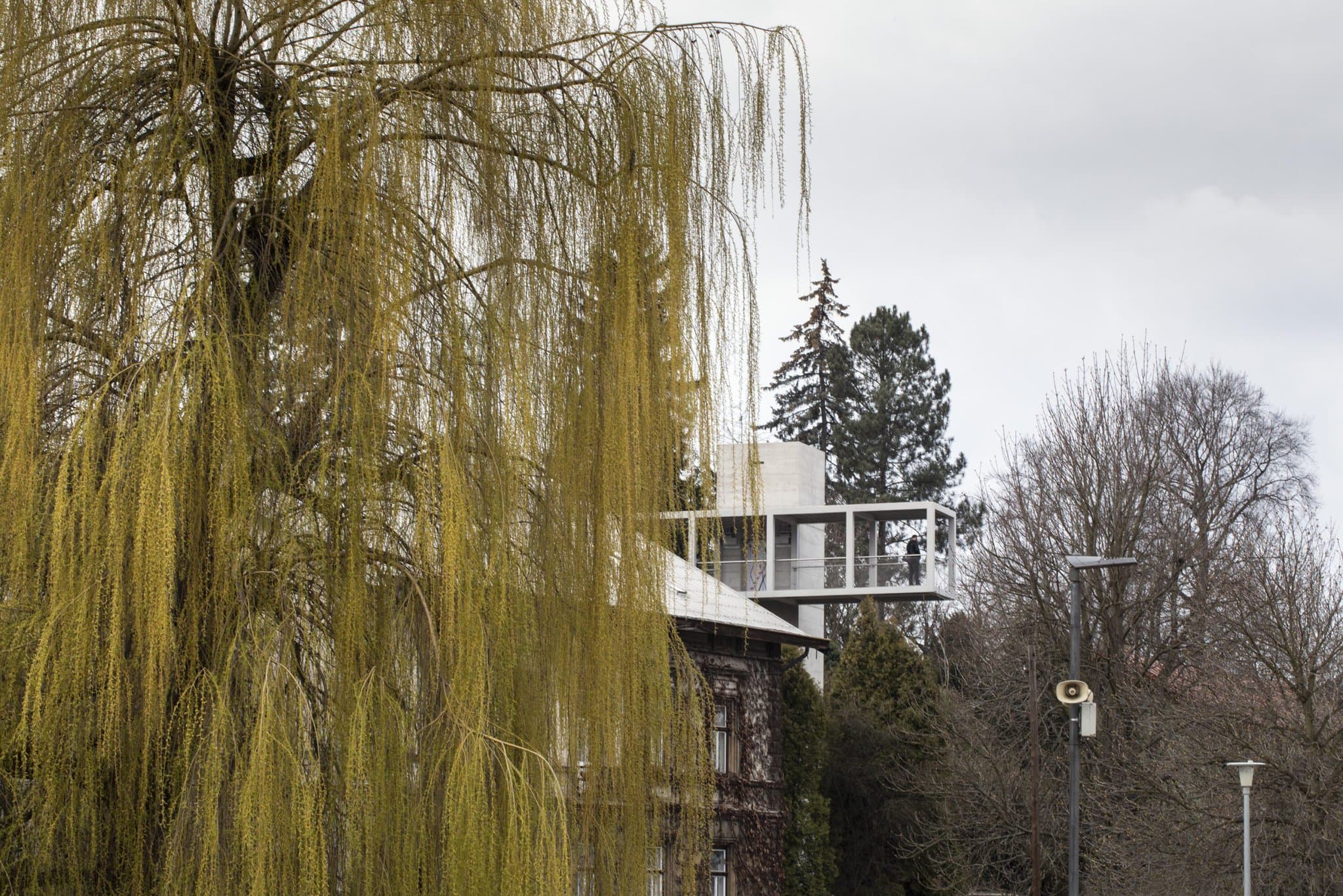 Stredný pilier stavby postupne prechádza do nového betónového schodiska. To je orientované smerom k ceste k Smetanovmu domu.