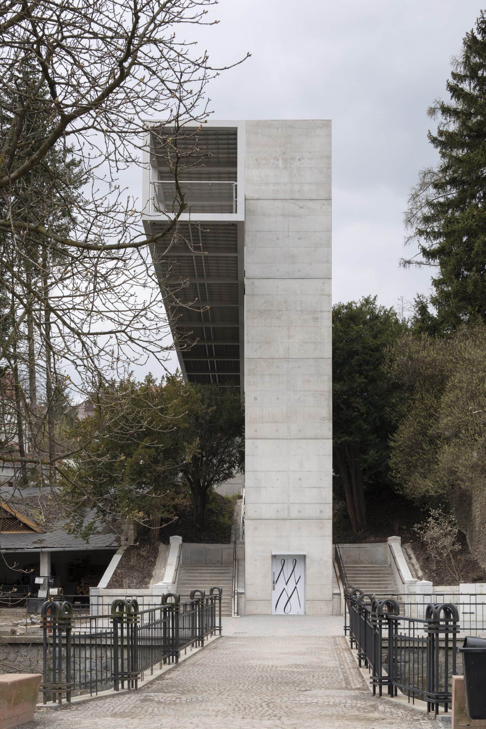 Nachádza sa tu aj prevýšený pylón výťahu, ktorý je umiestnený v osi pôvodného schodiska a nesie vlastnú konštrukciu lávky.