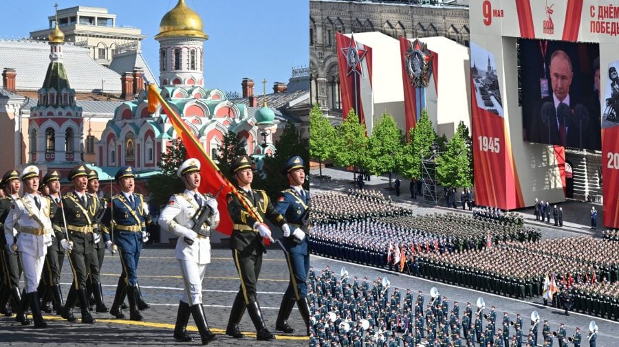 Putin, ktorý v krátkom prejave okrem iného vyhlásil, že celé Rusko stojí za ofenzívou na Ukrajine, sedel na tribúne vedľa čínskeho prezidenta Sia, ktorý je teraz jeho kľúčovým spojencom. Medzi zahraničnými hosťami boli tiež brazílsky prezident Luiz Inácio Lula da Silva alebo srbská hlava štátu Aleksandar Vučić.