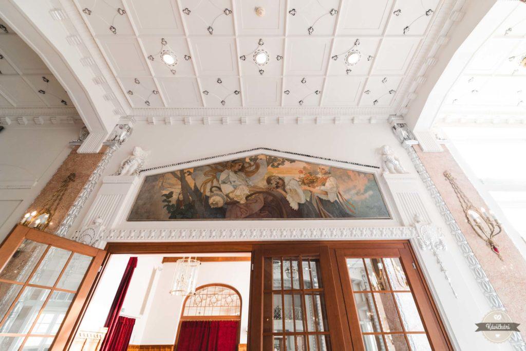 Ešte na skok k obrazu: Alfons Mucha Piešťany veľmi rád a často navštevoval, z vďačnosti preto v roku 1932 namaľoval presne na mieru obraz do hotela Thermia Palace. Dielo secesného umelca zdobilo reštauráciu secesného hotela 68 rokov, až kým ho niekto neukradol. Našťastie sa obraz na svoje miesto vrátil, keď sa však objavil, bol v zúboženom stave – vyrezaný a zrolovaný – a vedenie kúpeľov ho muselo dať reštaurovať. Dnes je našťastie už všetko tak, ako má byť.