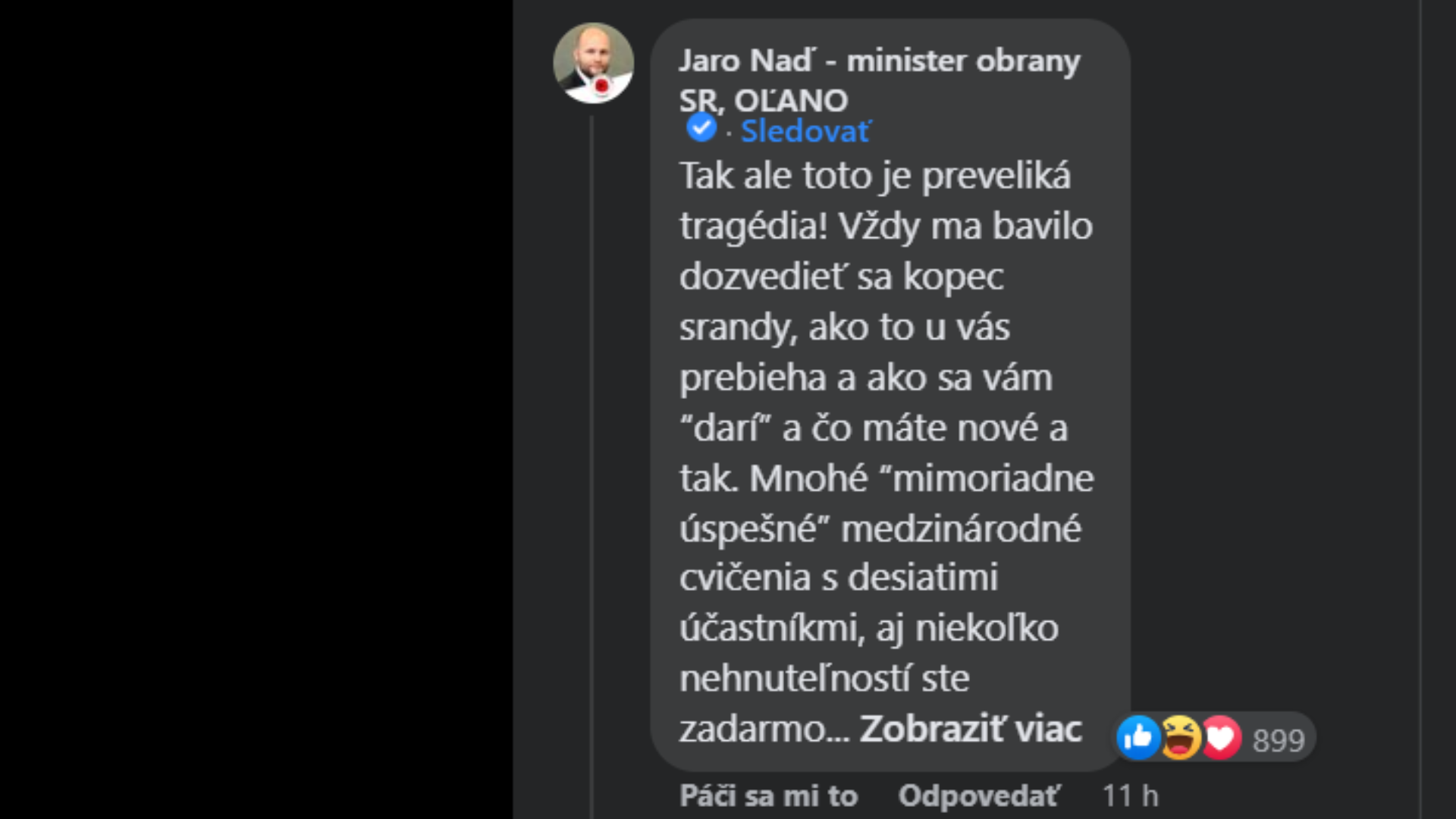 So skupinou Slovenskí branci sa pod ich príspevkom v komentároch rozlúčil aj minister obrany Jaroslav Naď. „Tak ale toto je preveliká tragédia!“ Tvrdí, že vždy ho bavilo sledovať, ako to v skupine prebieha a ako sa im „darí“.