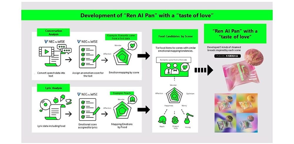 Technológia „NEC Data Enrichment“ následne priradila k textom a jedlám emocionálne skóre. Následne boli romantické texty zo show a jedlá, ktoré majú podobné emocionálne sklony, prepojené vizuálnou mapou. Vytvoril sa tak obraz o tom, ktoré jedlá prezentujú akú emóciu a naopak.