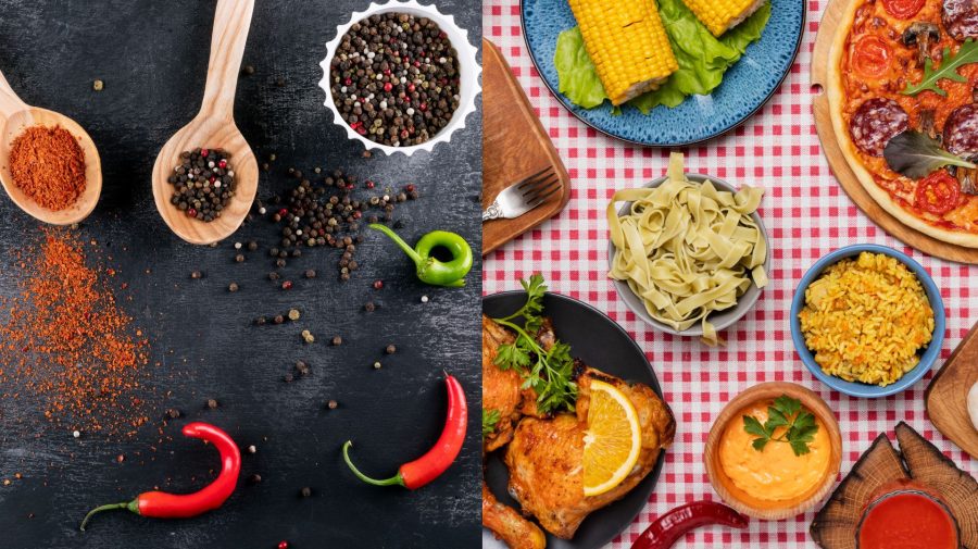 Na snímke štipľavé ingrediencie a stôl plný jedla.