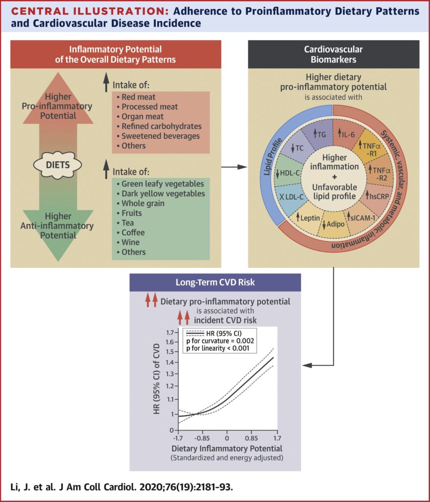 „Použitím empiricky vyvinutého potravinového indexu výživy na vyhodnotenie úrovní zápalu spojeného s príjmom potravy sme zistili, že stravovacie návyky s vyšším zápalovým potenciálom boli spojené so zvýšenou mierou kardiovaskulárnych chorôb,“ uviedla doktorka Jun Li, PhD. Autorka štúdie a vedúca na pozícii Štúdia a výskumu na oddelení výživy na Harvarde TH Chan School of Public Health. „Naša štúdia je medzi prvými, ktorá spája potravinový zápalový index v potravinách s dlhodobým rizikom kardiovaskulárnych chorôb.“