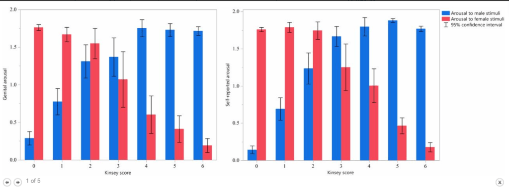 Pri stovke účastníkov neznamenali žiadne vzrušenie. Pri jedincoch, ktorí sa identifikovali ako bisexuáli, sa umiestnili medzi hodnotami 2 – 4. Muži, ktorí sa identifikovali podľa druhého stupňa, vykazovali skôr hodnoty na úrovni 3 stupňa. Vedci sa domnievajú, že je za tým motivácia mužov prispôsobiť svoju orientáciu väčšinovej.