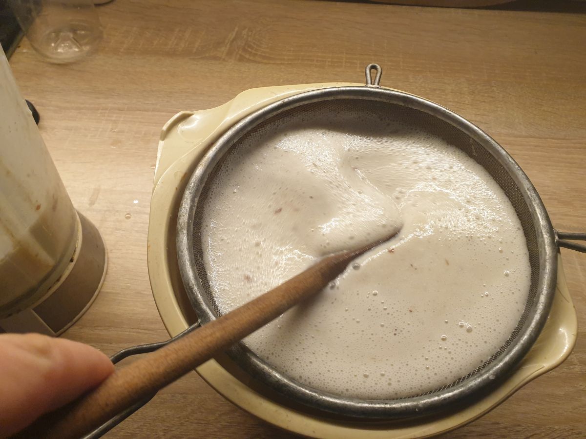 Nalejeme do kovového sitka. Niektorí ľudia odporúčajú filtrovať mlieko cez gázu alebo inú látku, ale pri tomto konkrétnom recepte to naozaj neodporúčam.