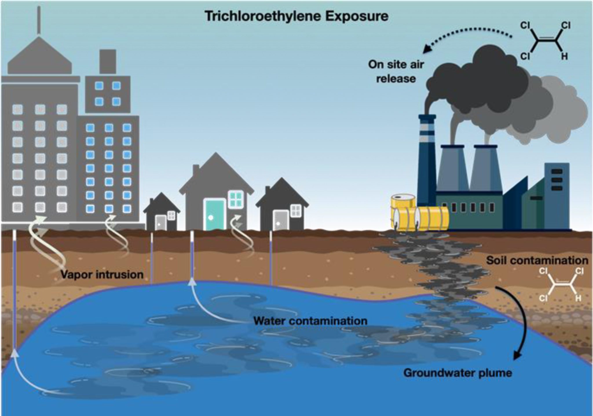 Najväčšiemu riziku kontaktu s touto chemikáliou sú vystavení ľudia v armáde, ako aj desiatky ďalších profesií, vrátane mechanikov, pracovníkov kanalizácie, lekárov a maliarov. Napriek tomu, že zdravotné účinky TCE sú známe už desiatky rokov, a domáce použitie rokmi síce kleslo, TCE sa napríklad v USA stále aktívne používa v priemysle a v čistiarňach odevov.