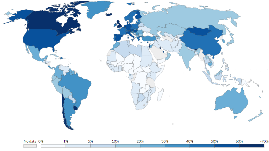 Aspoň jednu dávku dostalo 22 % populácie celého sveta. V Európe má momentálne jednu dávku 57 % dospelej populácie. Na Our world in data však vidíme, že situácia je diametrálne odlišná v rozvojových krajinách, kde dostalo jednu dávku v priemere len 0,9 % ľudí.
