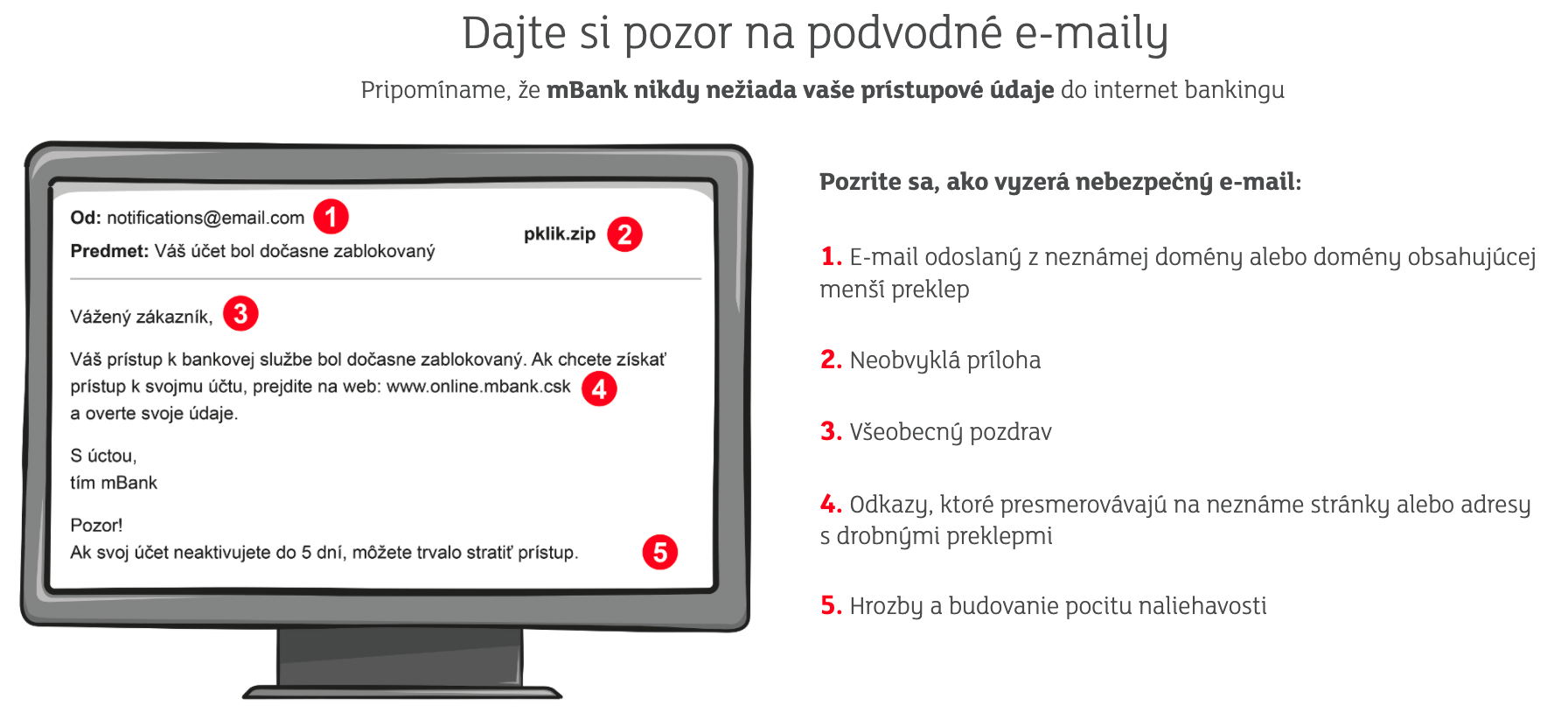 Slováci tak môžu byť vystavení hrozbám, o ktorých často nemajú dostatok informácií na to, aby ich vedeli včas odhaliť. Preto im do rúk dávame nástroje, ako zvýšiť svoju ochranu a snažíme sa rozširovať povedomie, aby prípadné nebezpečenstvo vedeli rozpoznať,“ vysvetľuje Martin Podolák, riaditeľ produktovej a procesnej divízie mBank Slovensko a ČR.