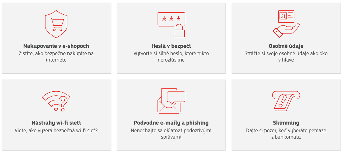 Klienti sa tak na webe dozvedia, ako môžu zvýšiť svoju bezpečnosť priamo v mobilnej aplikácii a ako si upraviť nastavenia pri svojich platobných kartách. Majú tiež možnosť naštudovať si, na čo si dávať pozor pri prihlasovaní sa do internet bankingu alebo to, ako je zabezpečená komunikácia medzi bankou a klientom.