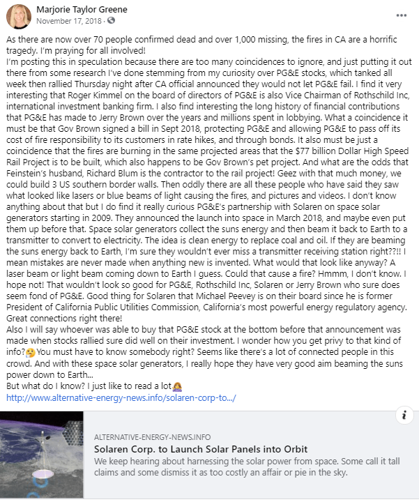 Greene v príspevku na Facebooku z roku 2018 tvrdila, že laserové lúče z vesmírneho satelitu mohli spustiť požiare v Kalifornii, čo je ďalšia nepodložená teória QAnon. Prvýkrát o príspevku informovala agentúra Media Matters for America, ktorá preskúmala históriu Greene Facebooku a Twitteru. Príspevok bol medzičasom odstránený, webová stránka pripojila snímky obrazovky s príspevkom.