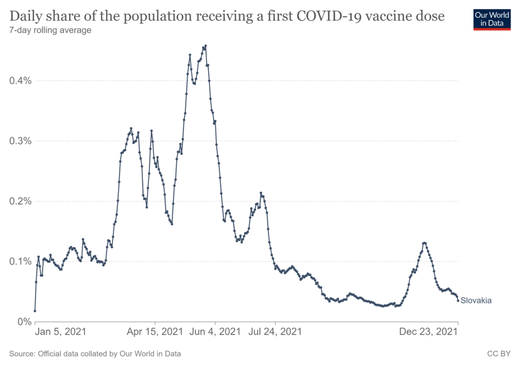 Čo naopak v decembri klesalo, bol záujem o prvú dávku vakcíny. Značný nárast bolo možno vidieť v novembri. Na konci mesiaca počet preočkovaných však dosiahol vrchol a od decembra má krivka klesajúcu tendenciu. Na prvý pohľad to teda môže vyzerať, že ľudí viac k prvej dávke motivoval lockdown a obmedzenia pre neočkovaných ako očkovacie bonusy.