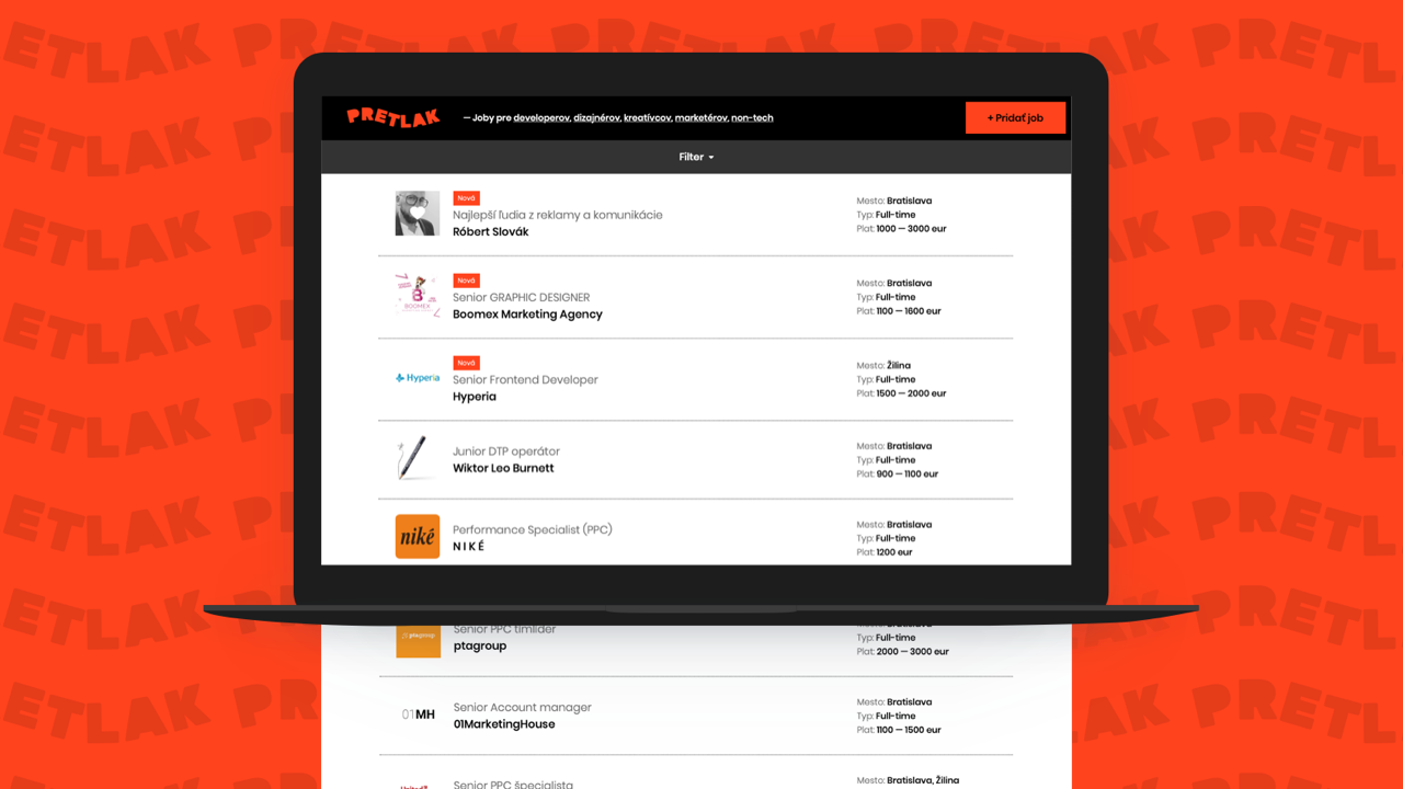 Takže si zapamätaj len jedno slovo – Pretlak. Nájdeš tam ponuky z oblasti marketingu, dizajnu, IT, či kopec ďalších jobov z kreatívneho sveta. Ak Pretlak ešte nepoznáš a nemáš dôvod mu veriť, pozri si partnerov, ktorí mu už teraz naplno dôverujú.