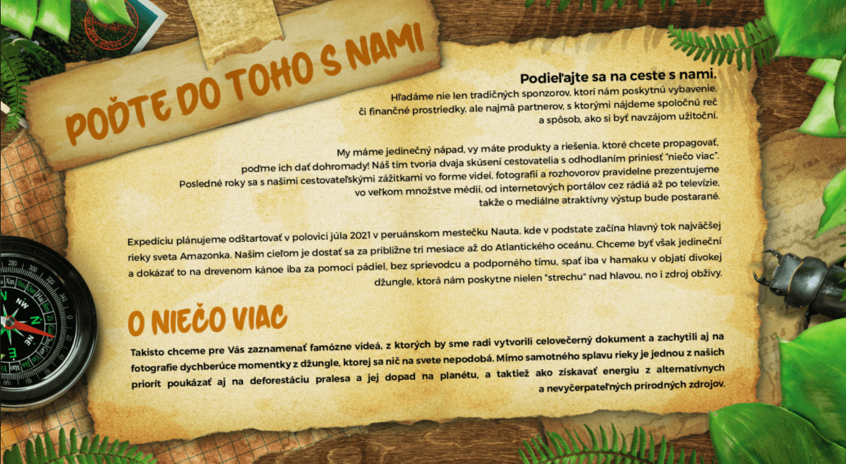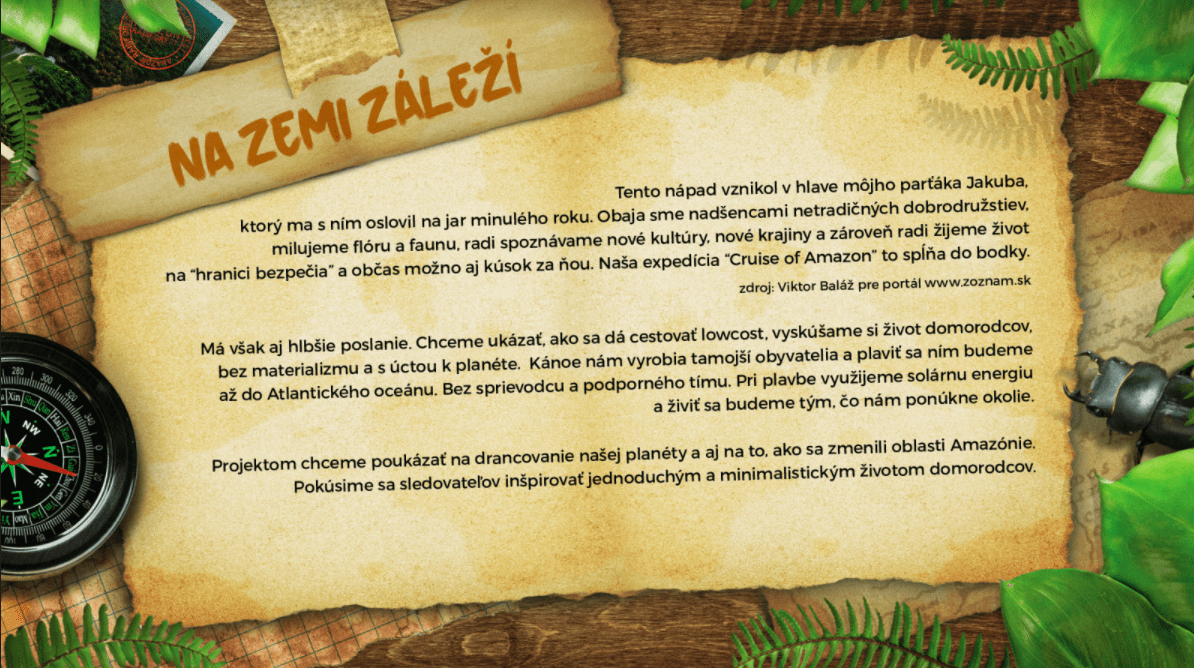 Fanúšikovia splavovania majú na Slovensku veľký výber riek, na ktorých strávia viac času. Splavovať sa dá napríklad Malý Dunaj, Hron, Dunajec či rieka Orava. Predstav si však, že úplne neznámy človek príde s nápadom splaviť v priebehu troch mesiacov Amazonku. Presne to sa stalo Viktorovi, ktorý neváhal a išiel do toho. Takto vznikol projekt Cruise of Amazon, ktorého súčasťou je 34-ročný Viktor Baláž a 29-ročný Jakub Bezeg.