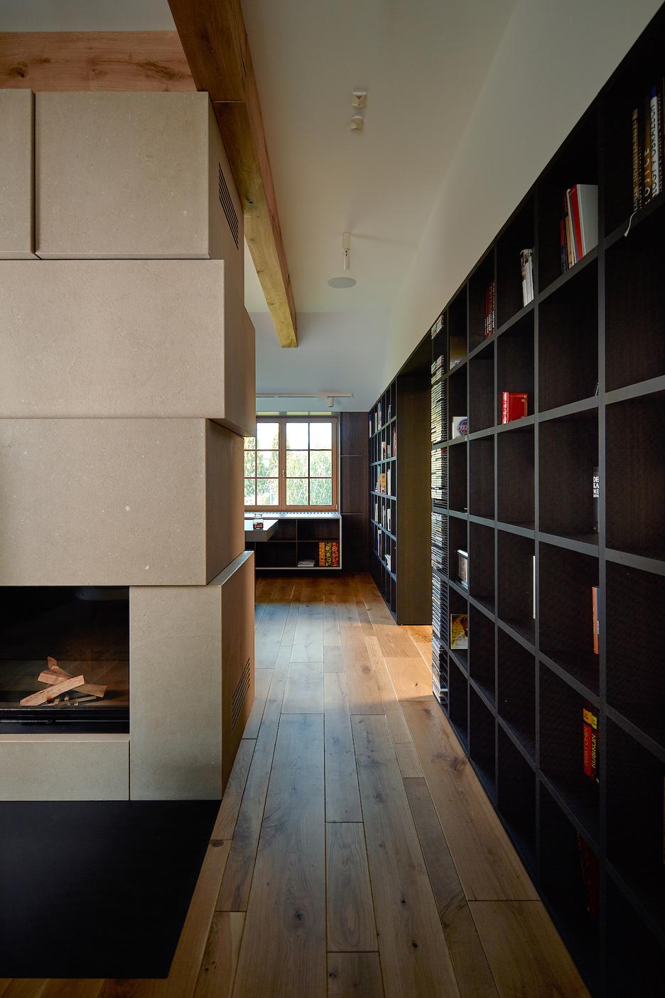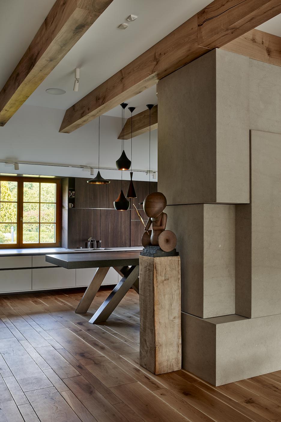 Ústredným prvkom priestoru sa stal centrálny kamenný kubus s krbom, obložený pieskovcovým obkladom s rôznymi hrúbkami, ktorý zároveň oddeľuje kuchyňu od jedálne a obývačky. Otvorenosť priestoru umožňuje čiastočný vizuálny kontakt obývacej, kuchynskej časti a TV miestnosti. Materiálovo a farebne je interiér ladený do mäkkých, prírodných odtieňov kameňa a dreva.