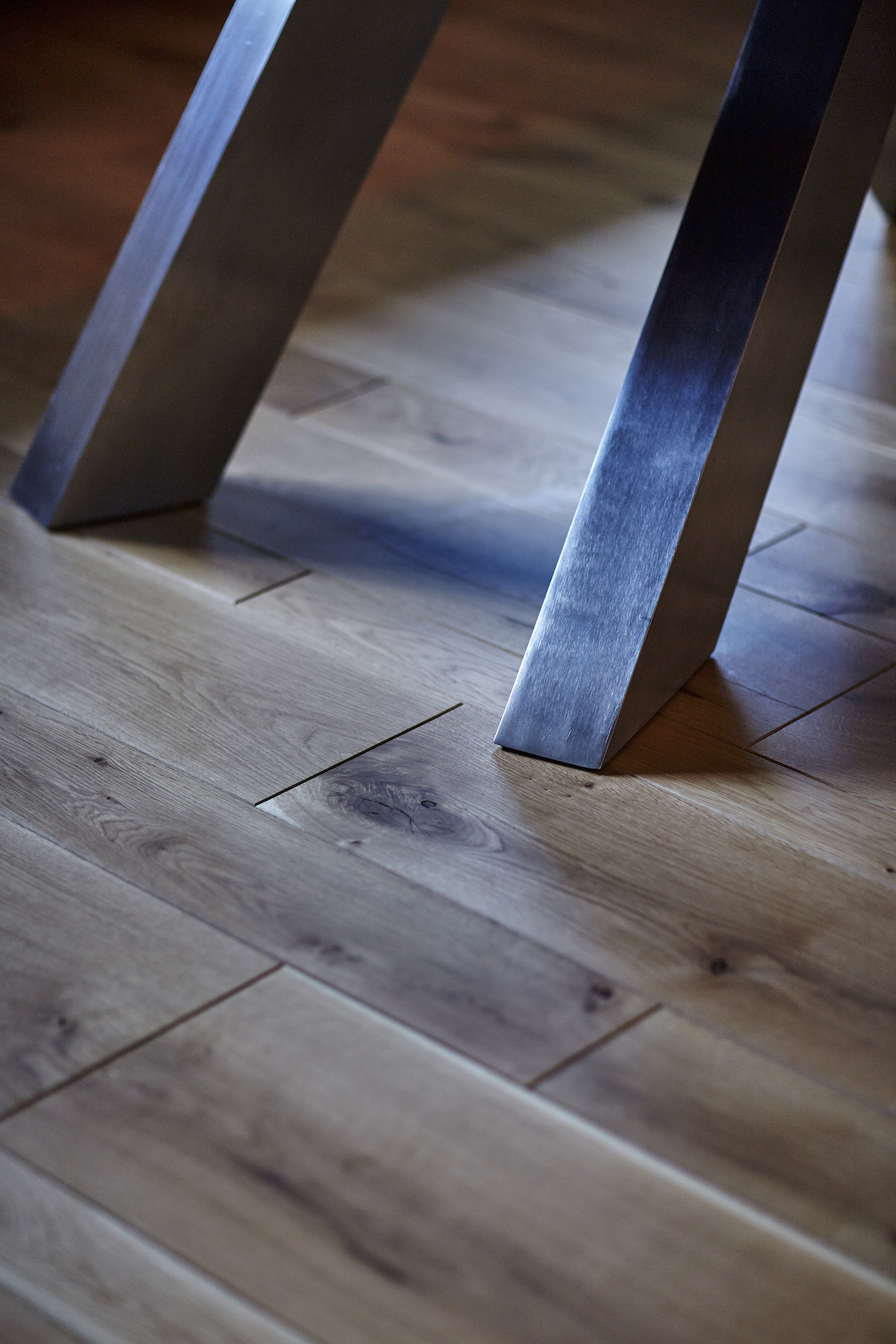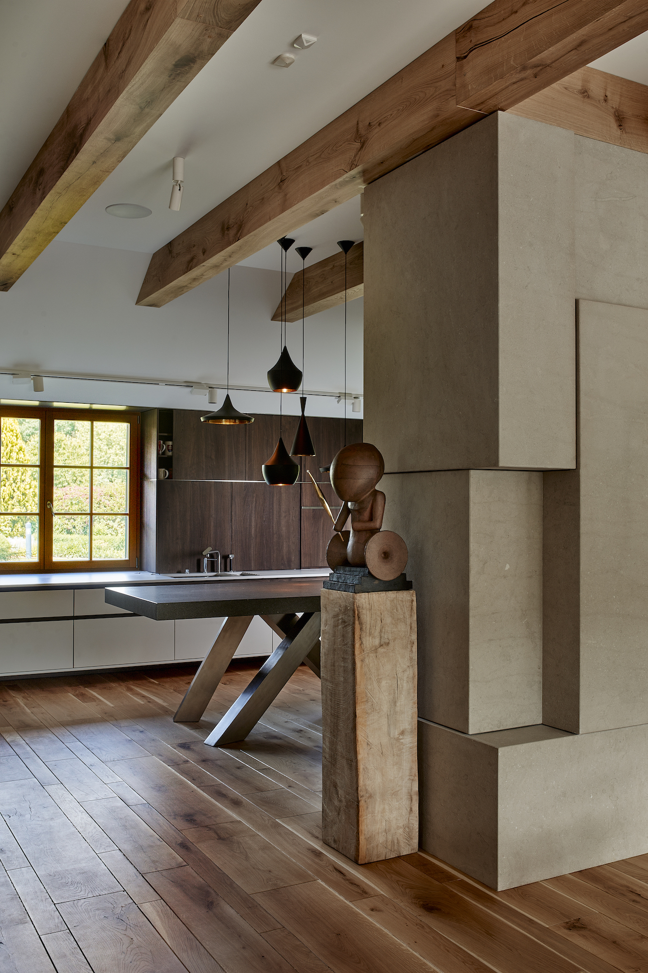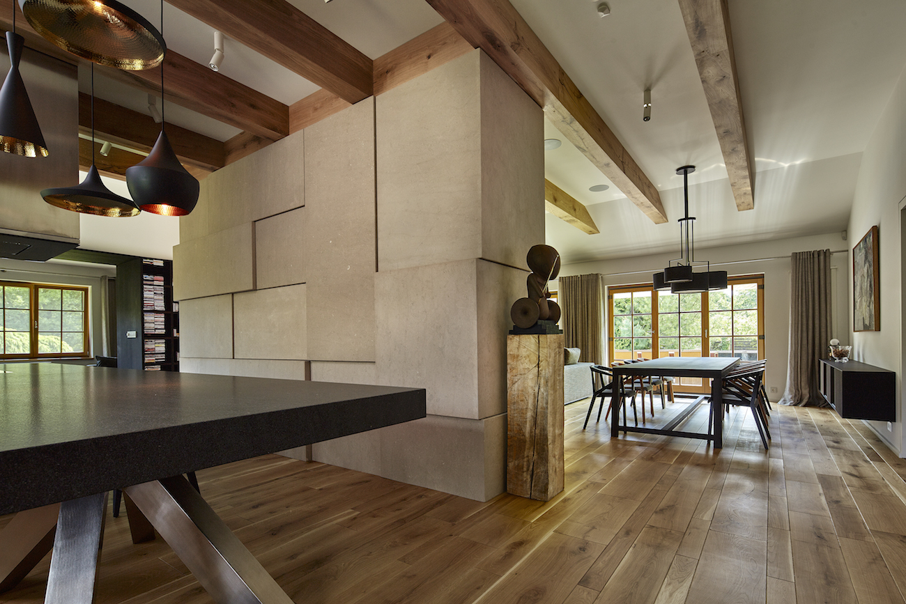 Ústredným prvkom priestoru sa stal centrálny kamenný kubus s krbom, obložený pieskovcovým obkladom s rôznymi hrúbkami, ktorý zároveň oddeľuje kuchyňu od jedálne a obývačky. Otvorenosť priestoru umožňuje čiastočný vizuálny kontakt obývacej, kuchynskej časti a TV miestnosti. Materiálovo a farebne je interiér ladený do mäkkých, prírodných odtieňov kameňa a dreva.
