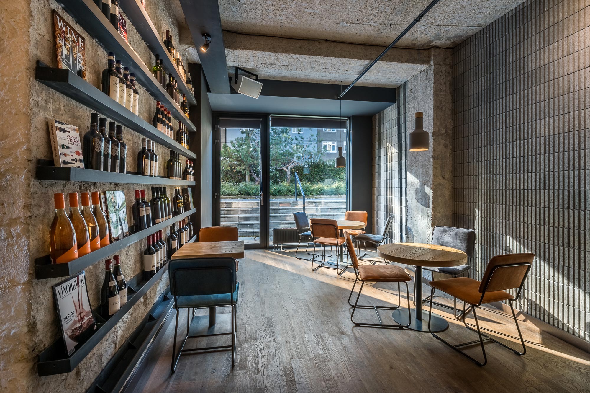 Vinobar je rozdelený na 2 časti. V prvej vstupnej miestnosti sa nachádza bistro s barovým pultom a sedením. Priestoru dominuje stena z betónových tvárnic a namieru vyrobená kovová polica na fľaše s vínom.