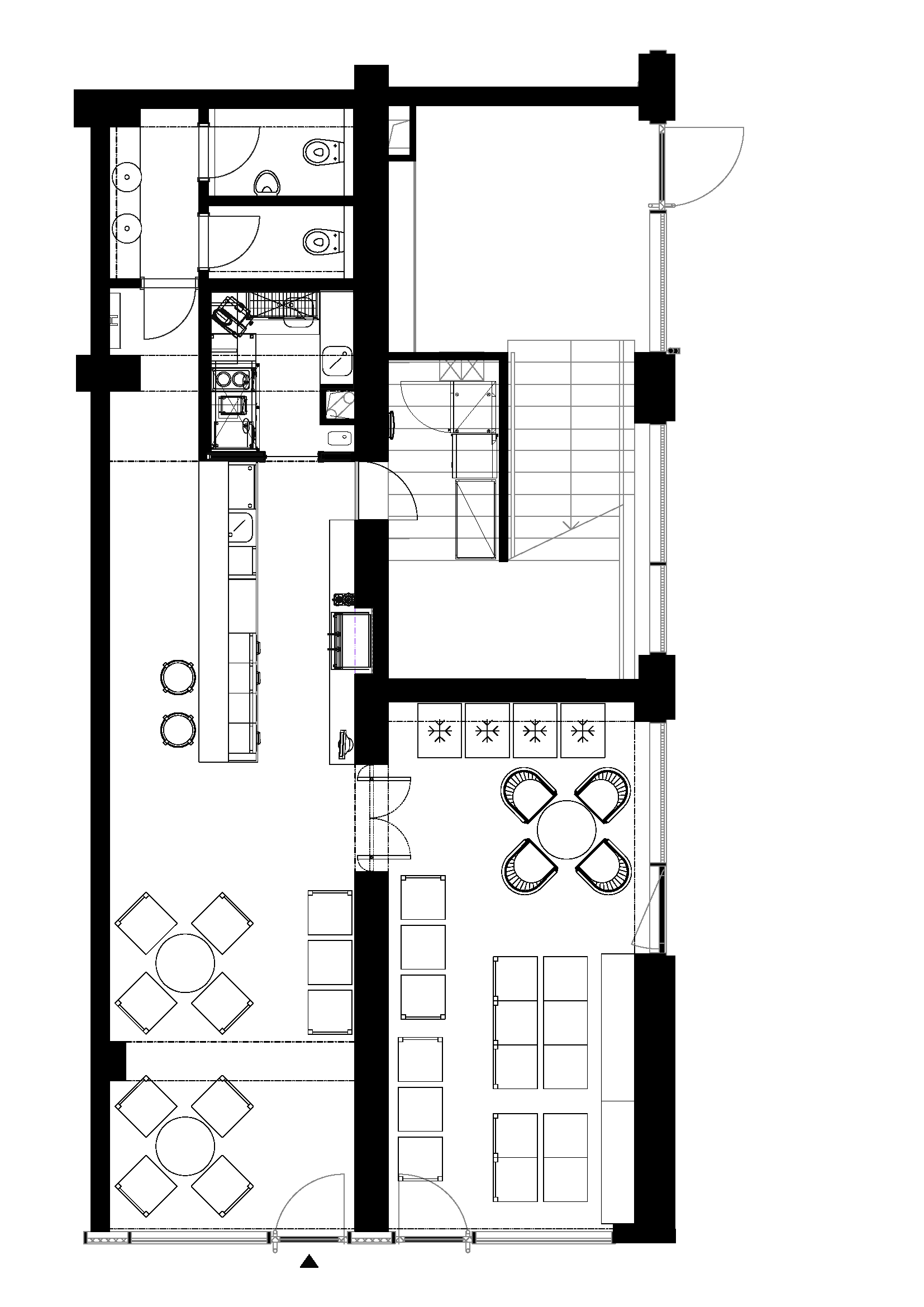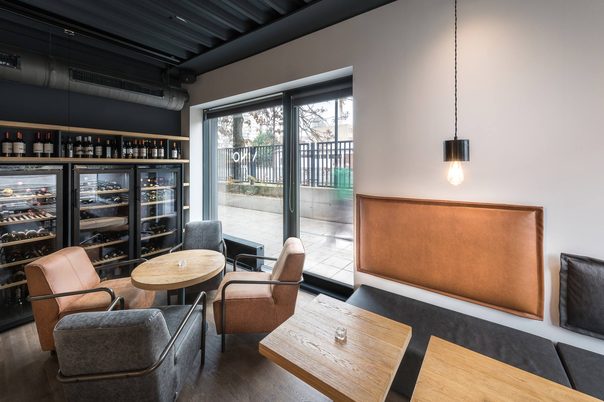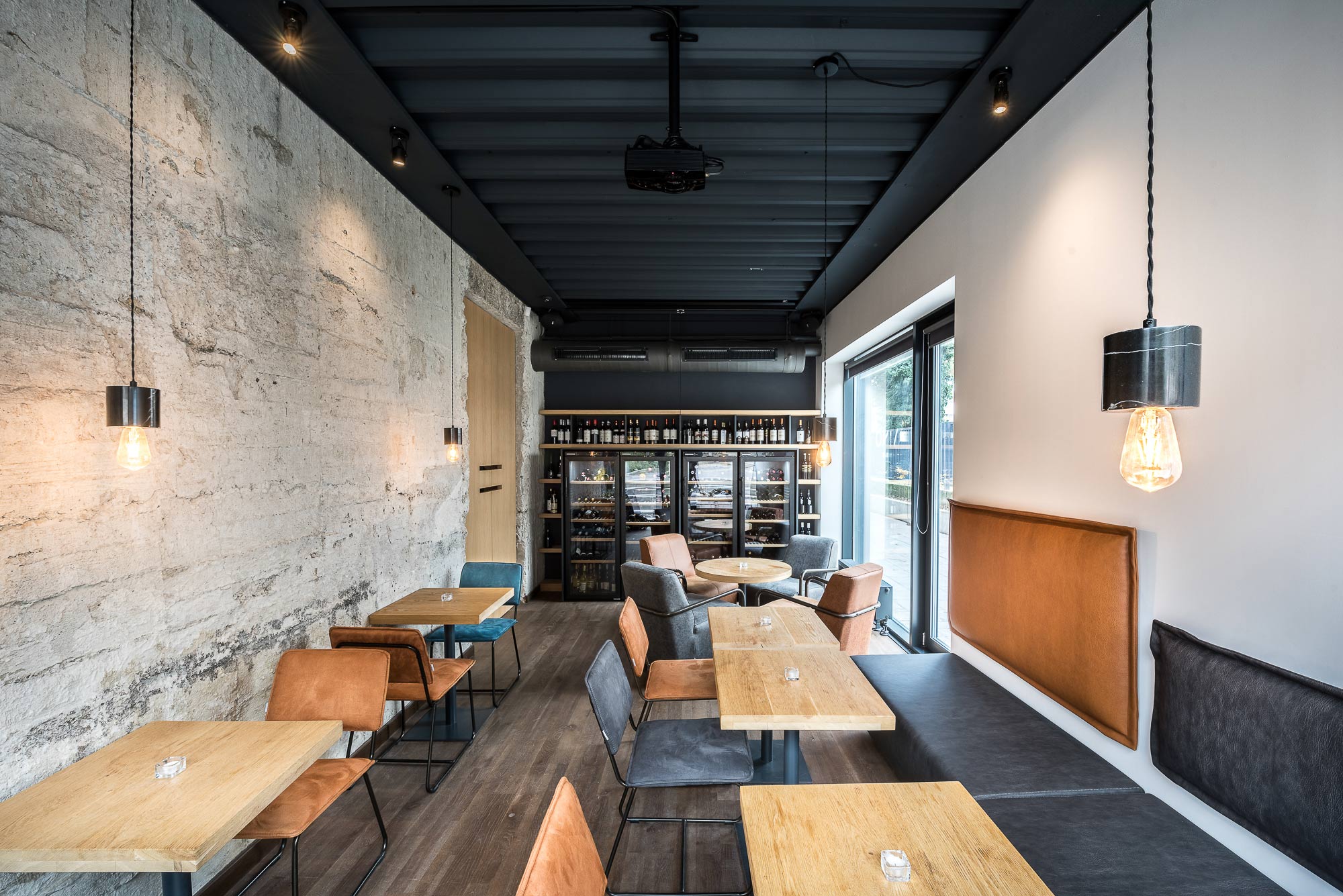 - Interiér bistra a denného baru v parteri polyfunkčného objektu. Pri rekonštrukcii zostali zachované pôvodné betónové konštrukcie. Návrh architektov pomohol získať priestoru novú kvalitu.