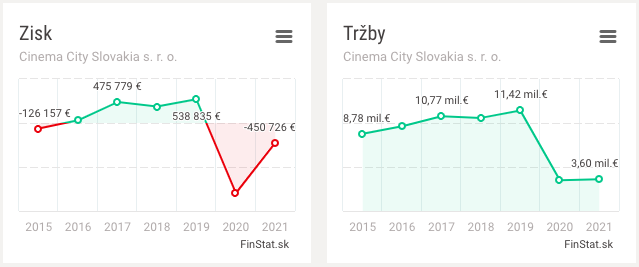 Sieť kín Cinema City si na Slovensku prešla veľmi ťažkým obdobím počas pandémie, podľa verejne dostupných informácií na stránke Finstat.sk sa vlani prepadla do takmer polmiliónovej straty. Na Slovensku sú momentálne tri kiná tejto značky, všetky sú v Bratislave.