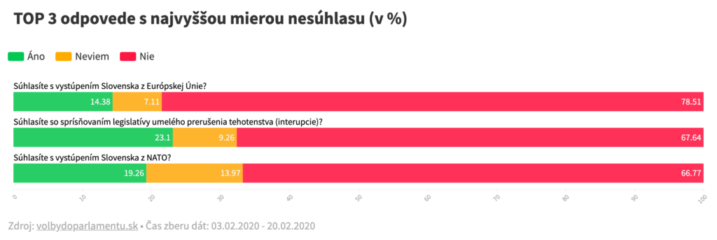 Snahy viacerých politických strán, ktoré chcú, aby Slovensko vystúpilo z EÚ či NATO sa však v tomto prípade nestretli s porozumením. Najviac Slovákov (78,5%) nesúhlasí s vystúpením Slovenska z EÚ. Vyše 67% je taktiež aj proti sprísneniu legislatívy k interupciám a podobná časť ľudí je aj proti vystúpeniu Slovenska z NATO.