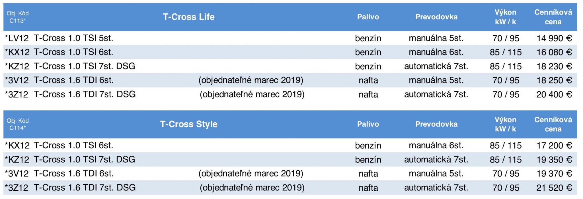 Malé SUV od Volkswagenu bude od začiatku k dispozícii v dvoch výbavových verziách: Life a Style. Jediným voliteľným motorom spočiatku bude prepĺňaný benzínový trojvalec 1,0 TSI. Od marca 2019 do ponuky VW T-Cross pribudne aj štvorvalcový turbodiesel 1,6 TDI, neskôr aj výkonnejší benzínový štvorvalec 1,5 TSI.