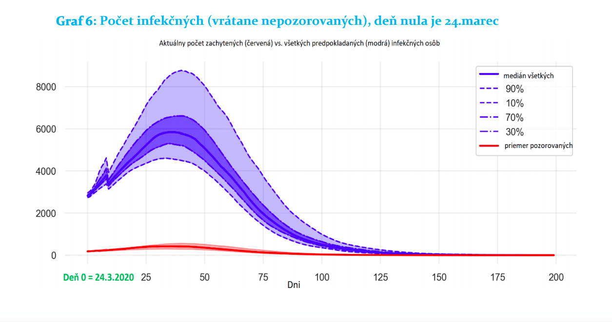 V modeli však upozorňuje aj na fakt, že časť infikovaných ľudí môže byť pod radarom vlády, teda sú pozitívni na koronavírus, ale nie sú testovaní a zaradení do štatistík.