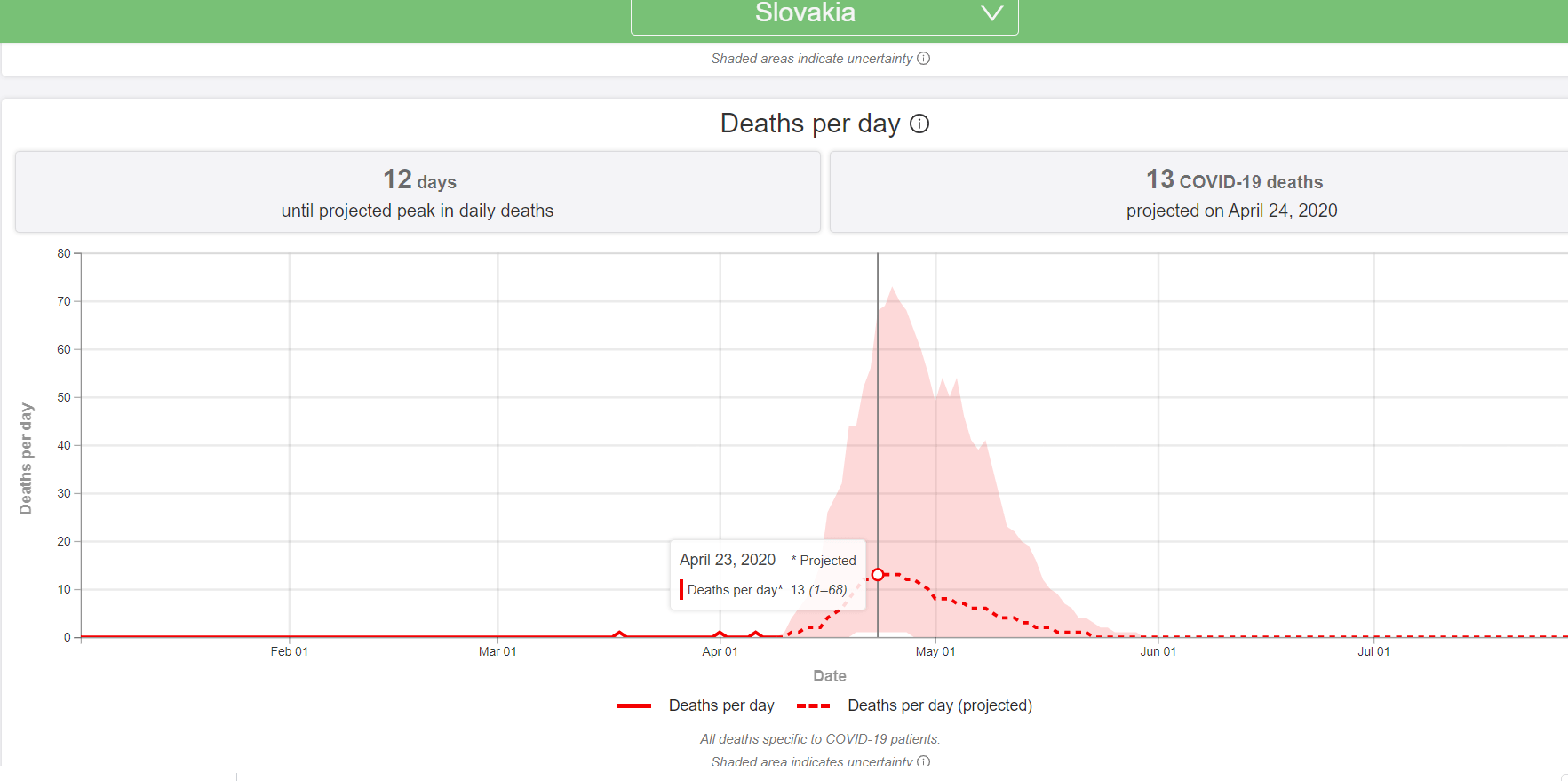 Od 23. apríla by sa však počet infikovaných ľudí a počet obetí mal stabilizovať a postupne klesať. Najviac úmrtí by malo Slovensko zaznamenať 24. apríla, a to presne 13.