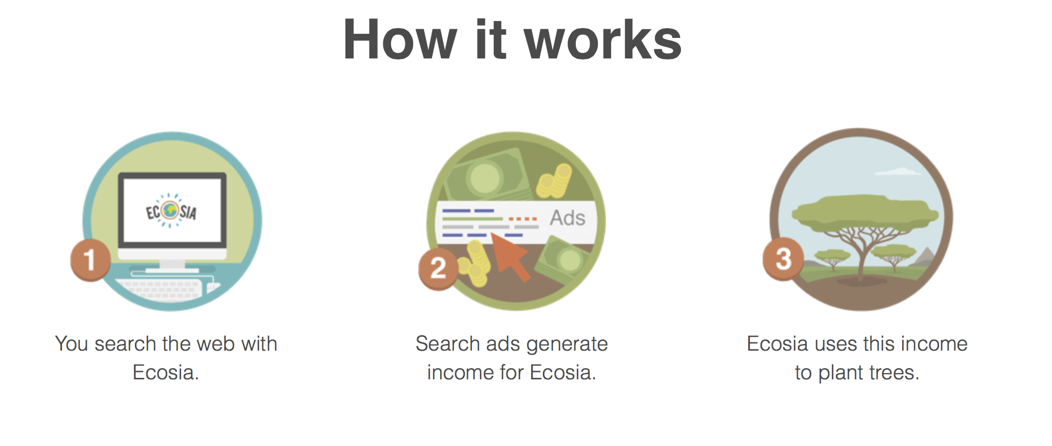 Ecosia je eco-friendly alternatíva Googlu. Funguje rovnako ako akýkoľvek iný vyhľadávač, avšak zisk z reklám investuje na vysádzanie stromov. Odhaduje sa, že až 80% zisku je preinvestovaných na to, aby bola naša planéta zelenšia.
