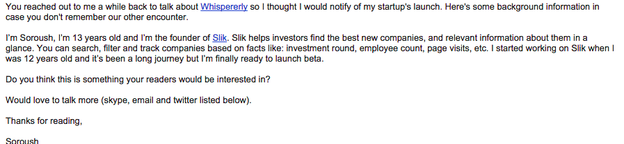 „Slik je veľmi náročný back-endový startup. Udržiavať ho pri živote ma bude mesačne stáť stovky dolárov. Mal som odložené peniaze z obchodovania so zlatom a úspory, ktoré som dostal od známych, ale tieto zdroje som minul pri budovaní základov Sliku. Mohol by som si požičať od priateľov a známych, potom by však Slik nebol niečím, čo som postavil ja. Bol by som odkázaný na iných a to nechcem.“, dodáva Soroush. Musím povedať, že to nie sú zrovna problémy každého 13 ročného… Jeho úsilie budem určite sledovať. Ak sa mu Slik podarí dotiahnuť do úspešného konca – verím že áno, bude to jeden z najlepších pomôcok pre tých, čo chcú investovať, ale napríklad aj pre médiá ako Startitup, ktoré sa startupom venujú a hľadajú zaujímavé príbehy.
