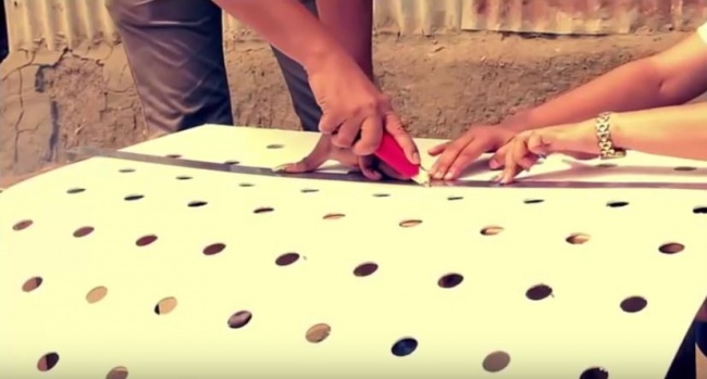 Tvorba jedného z týchto DIY „klimatizačných jednotiek“ je naozaj jednoduchá a lacná. Najprv je nutné urobiť diery vo veľkom kuse hrubého kartóna. Otvory by mali byť dostatočne široké, aby cez ne prešli hrdlá fliaš.