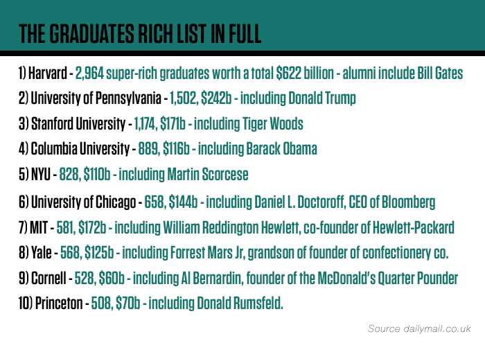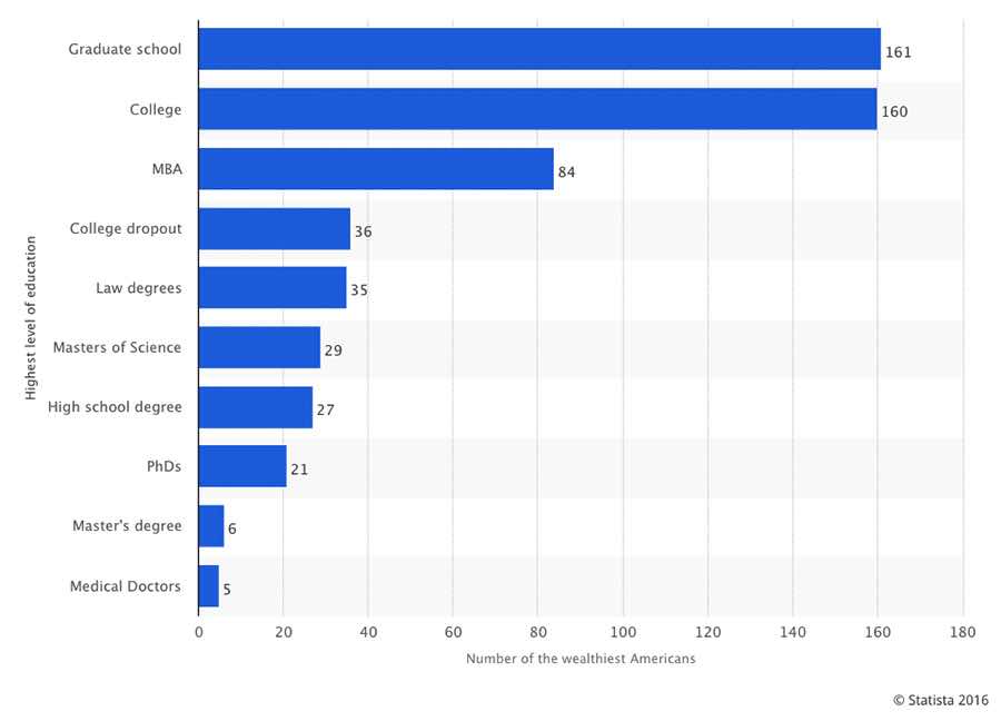 Forbes spravil v roku 2012 prieskum štyristo najbohatších američanov, s cieľom zistiť najvyššie dosiahnuté vzdelanie respondentov.
