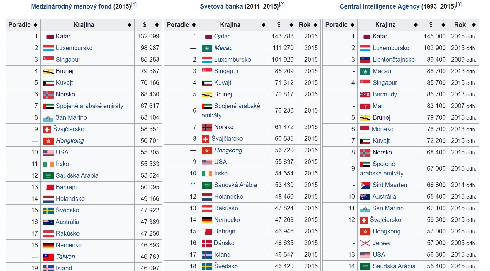 A to s nemalým náskokom. Pokojne môžeš HDP Švajčiara či taktiež bohatého Nóra vynásobiť dvomi, no stále bude pozadu za Arabom z Kataru. Pozri si rebríčky, kde žijú podľa HDP na obyvateľa najbohatší ľudia, ktoré vytvorili tri rôzne zdroje. Vo všetkých troch bez prekvapenia jasne dominujú obyvatelia Kataru.
