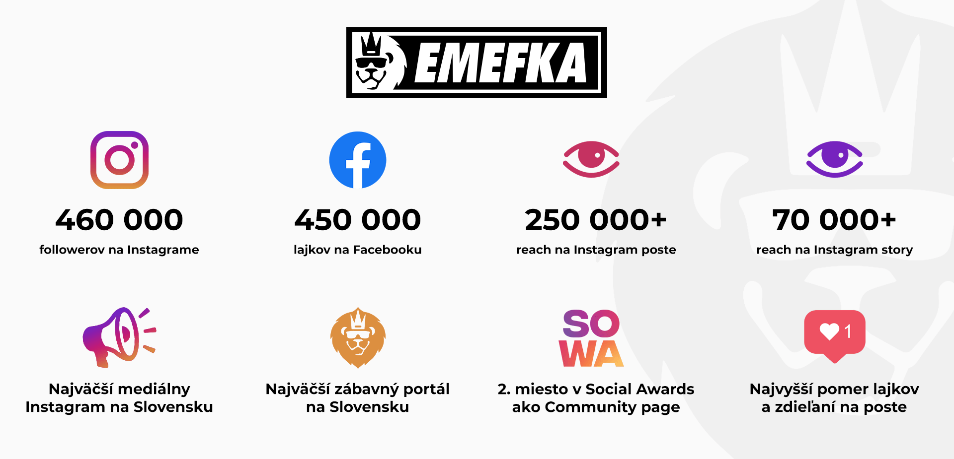 Pokiaľ vidíme priestor a zábavný potenciál, produkty mladej cieľovke komunikujeme cez náš portál Emefka, ktorý sa so 460-tis. followermi na IG špecializuje na instantnú zábavu. Keďže ide o najväčší mediálny Instagram na Slovensku so státisícovými dosahmi, virálnosť klientskeho postu vieme garantovať.
