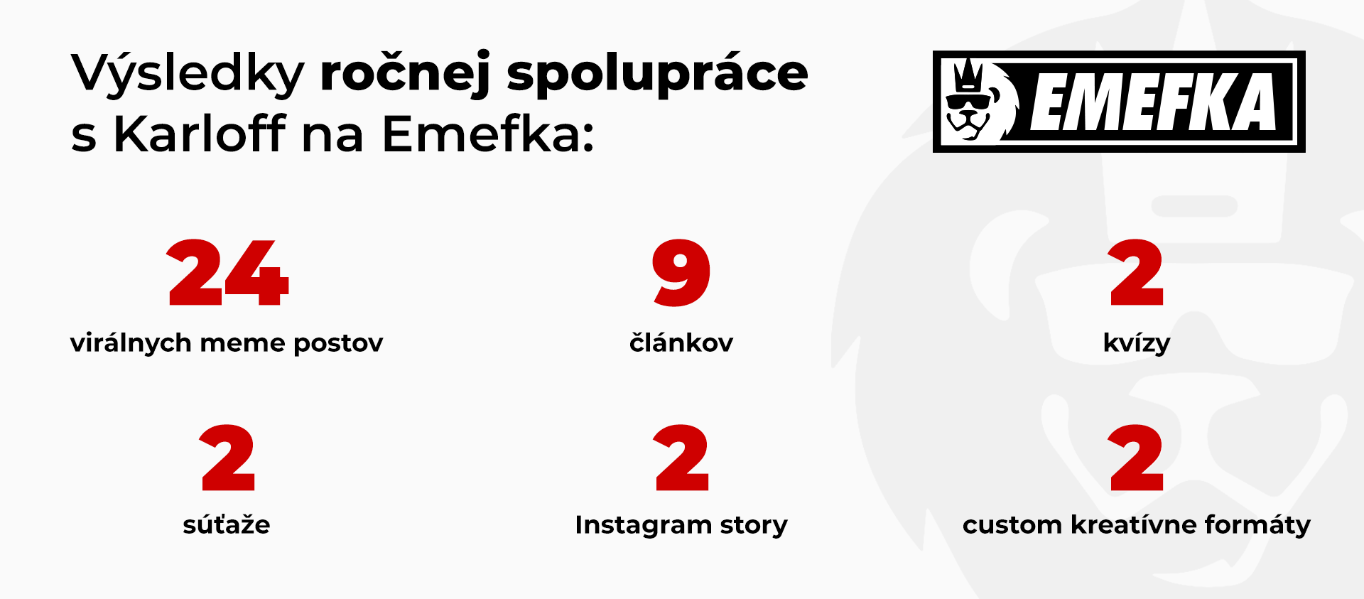 - Za rok 2020 sme na Emefka vyprodukovali 24 virálnych postov pre Karloff, ktoré spolu dosiahli ďaleko cez 6,7 miliónov impresií len na Instagrame a približne ďalších 4,5 milióna impresií na Facebooku.