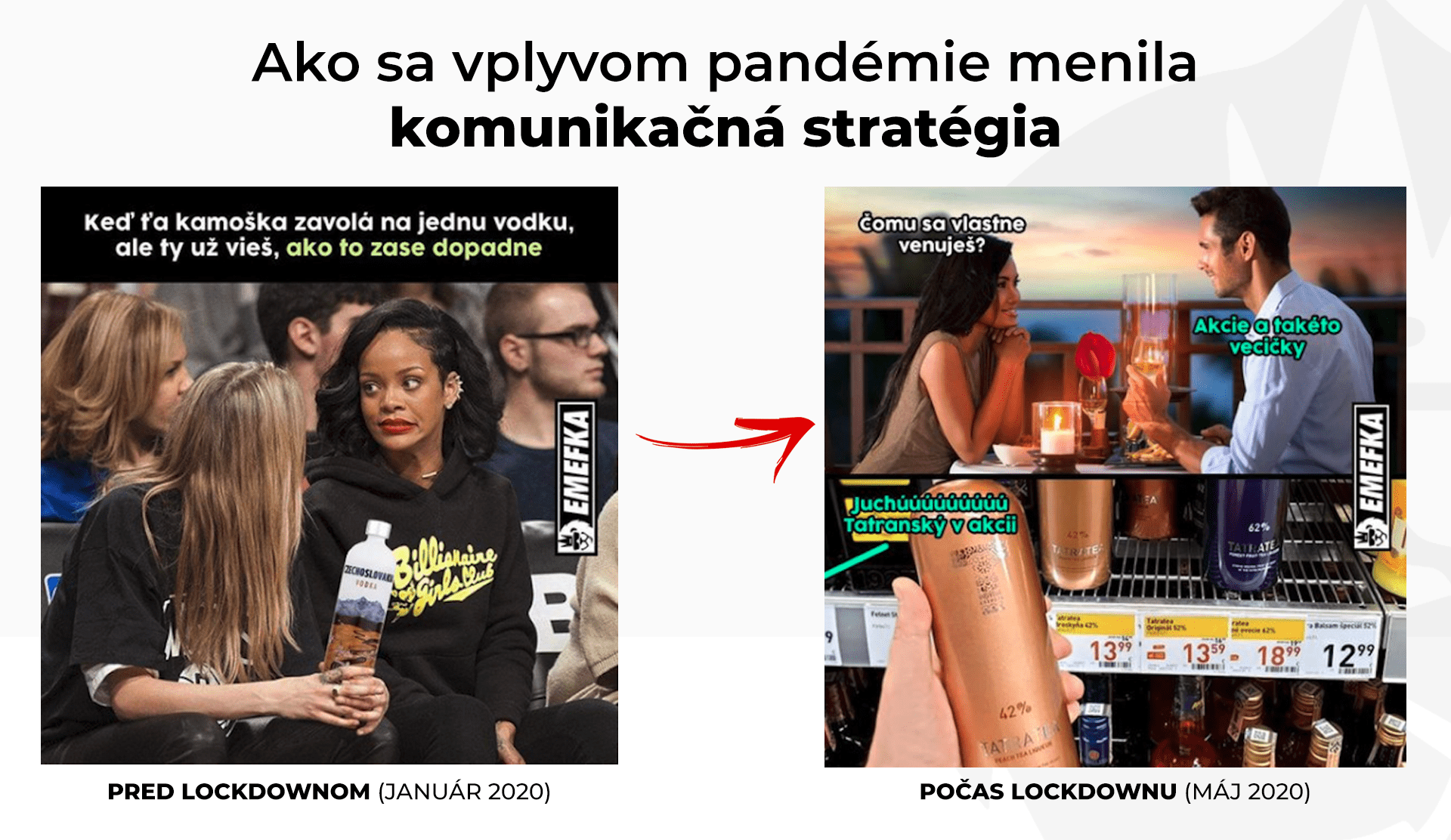 Po príchode lockdownu sme však naratív pozmenili a virálne sme začali komunikovať zľavy produktov v supermarketových reťazcoch, keďže komunikovať alkoholické nápoje v predchádzajúcom kontexte párty a večerov v meste už nebolo vhodné.
