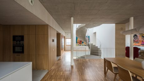 Dôležitými prvkami domov sú ich schodiská. V dome investora nájdeme točité monolitické železobetónové schodisko, ktoré spája všetky podlažia a umožňuje vertikálny priehľad celým domom.