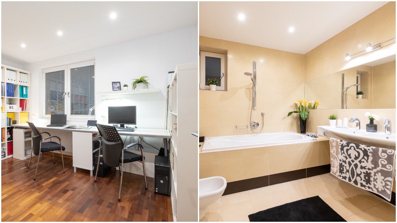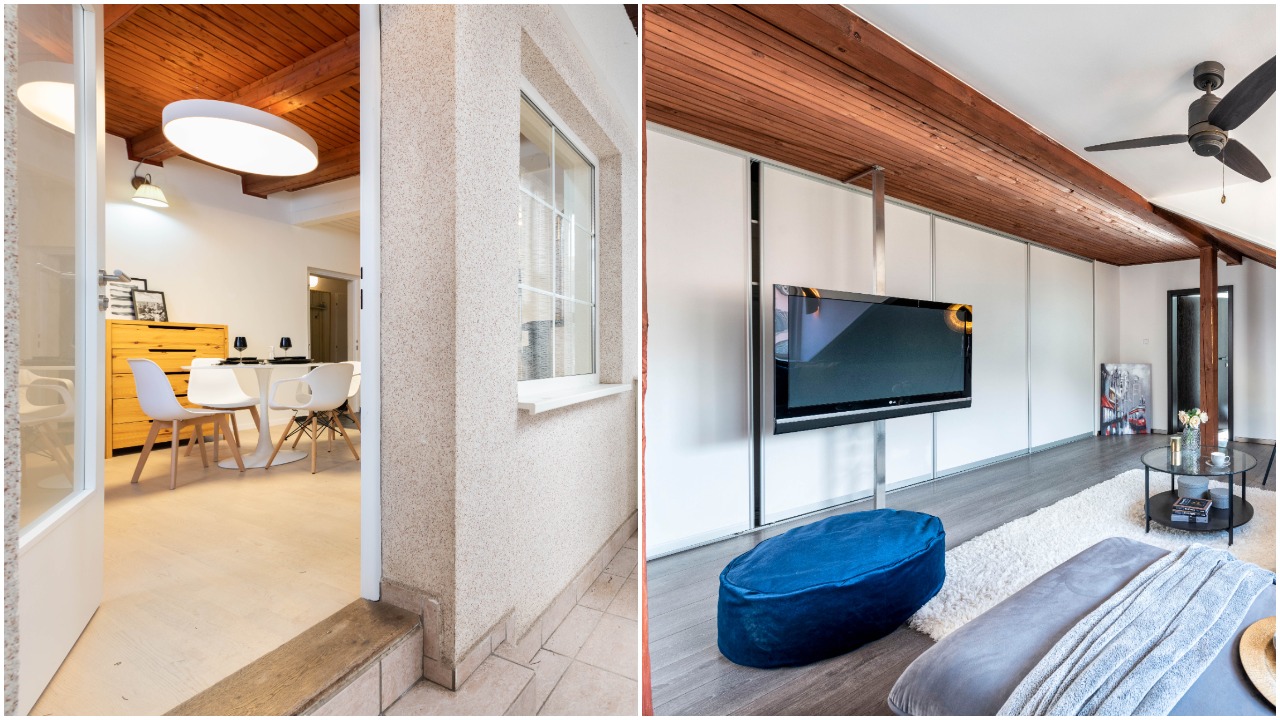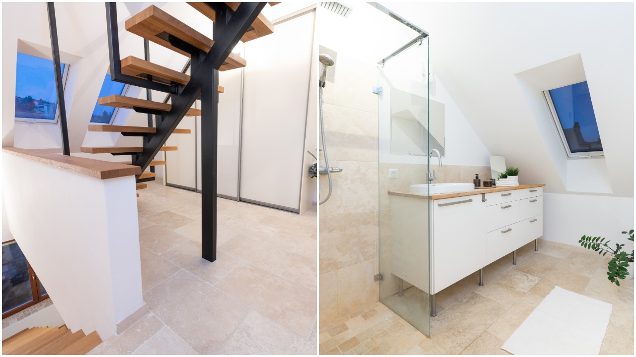 V nehnuteľnosti je aj samostatná časť, ktorá funguje ako 2-izbový byt. Do tejto časti sa dá dostať vlastným vstupom. Prízemie je ladené do neutrálnych tónov, kúpeľňa je svetlá.
