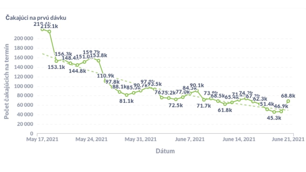 Spomínané číslo čakateľov sú všetky osoby čakajúce na prvú dávku vakcíny. Najviac čakajúcich bolo v čakárni 17. mája, kedy boli verejnosti sprístupnené aj dáta o počte čakateľov.