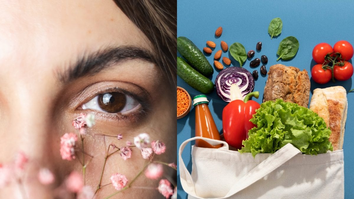 Na snímkach detail oka a potraviny.