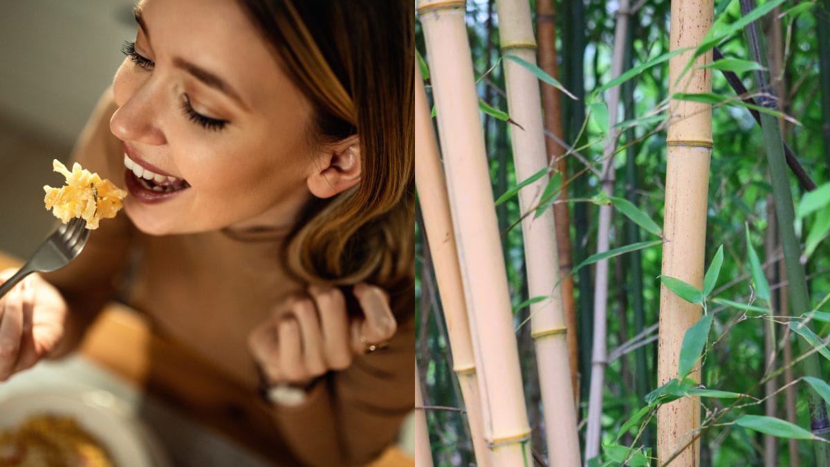 Na snímke žena, ktorá konzumuje jedlo a na ďalšej snímke je bambus.