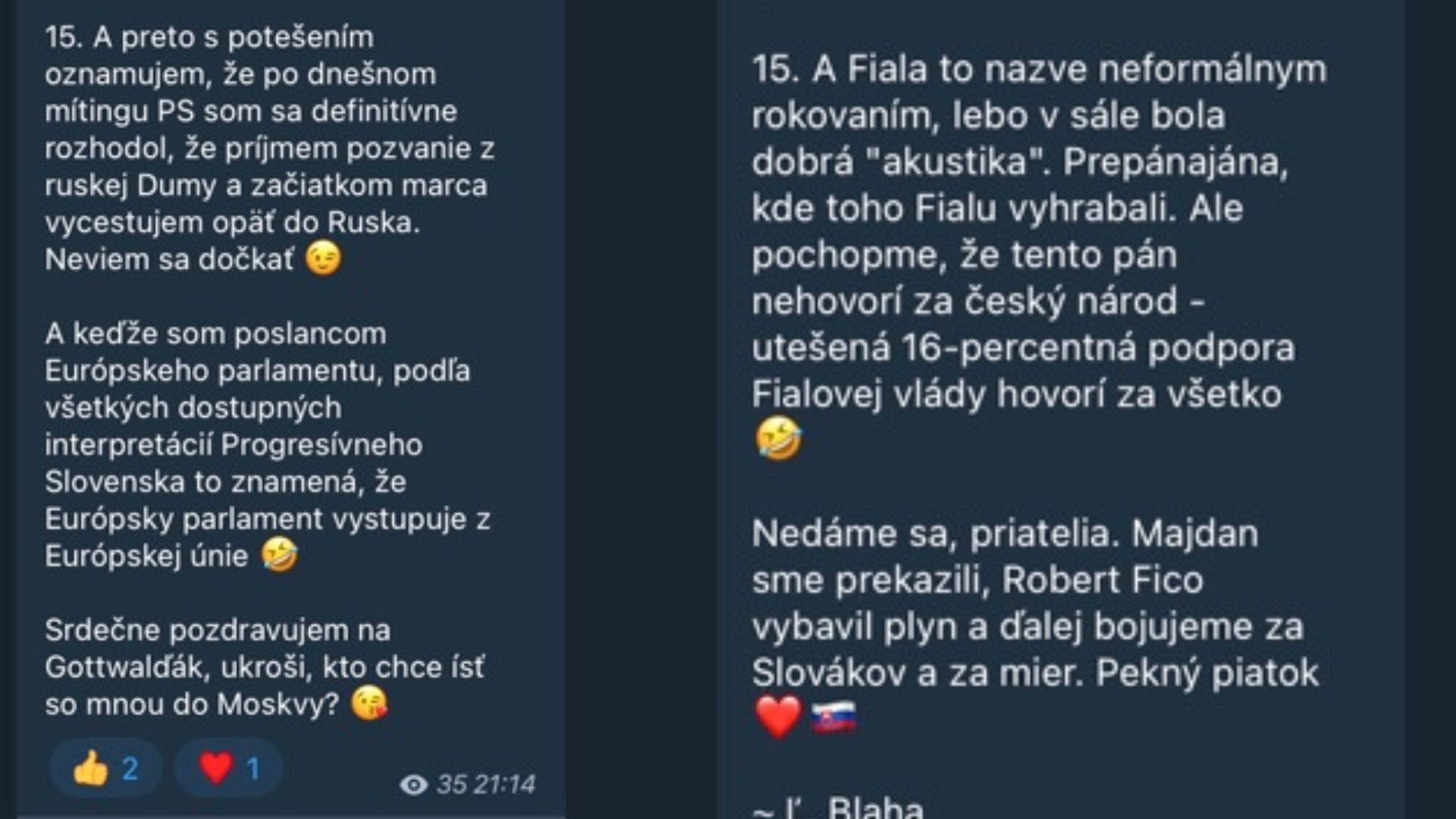 O tomto vyjadrení informoval ešte v piatok večer Denník N. Dnes sme sa už však k tomuto vyjadreniu europoslanca Blahu nevedeli dopátrať. Na jeho oficiálnom facebookovom profile aj na Telegrame strany Smer-SD totiž príspevok vyzeral trochu inak, než sa pôvodne uvádzalo.