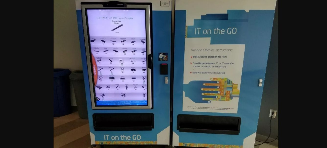 Zamestnanci spoločnosti Intel majú k dispozícii tento samoobslužný automat s dotykovým displejom, vďaka ktorému môžu kedykoľvek zrealizovať „kúpu“ potrebného počítačového príslušenstva.