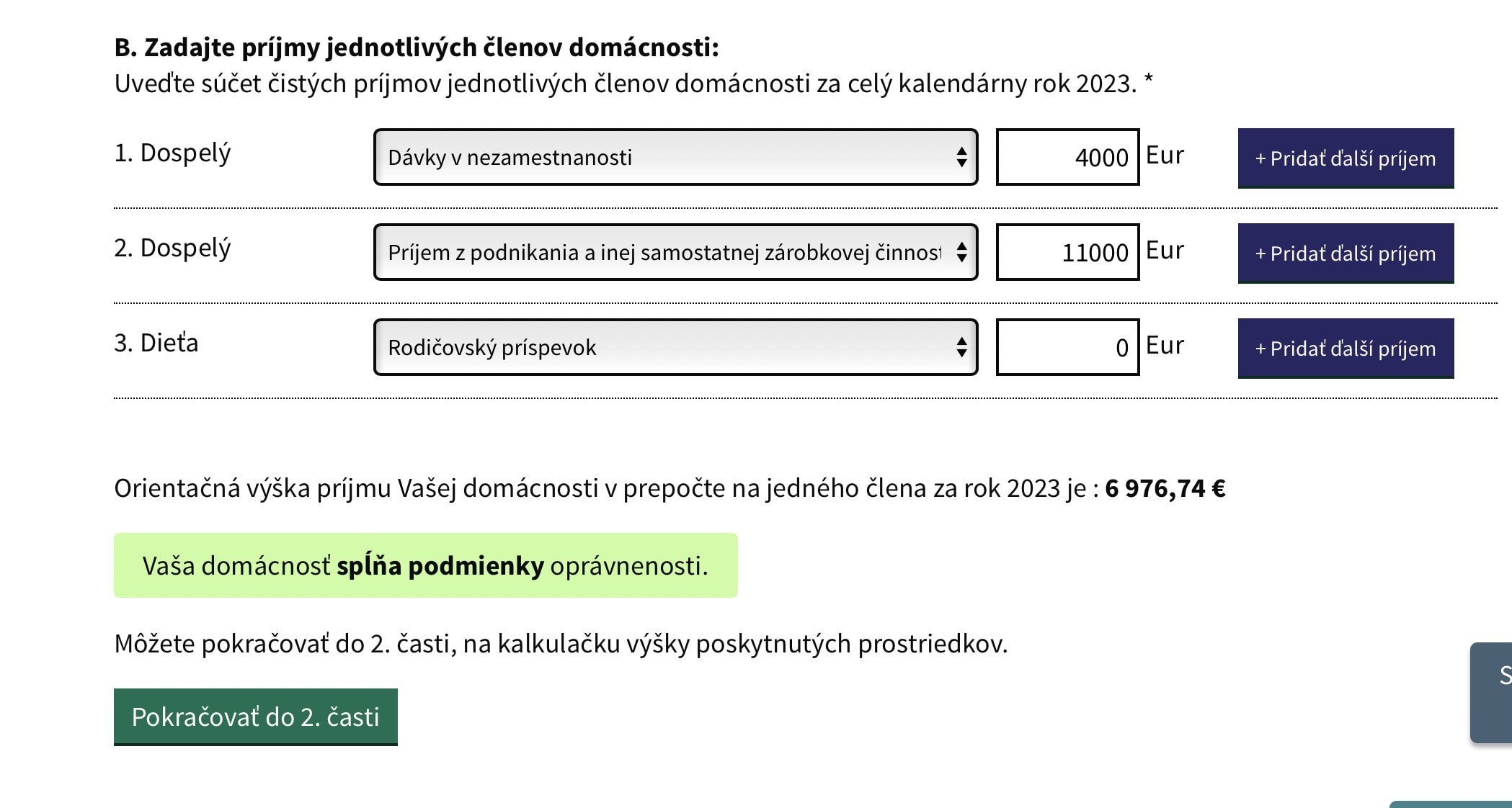 Pri posudzovaní oprávnenosti žiadateľa sa zohľadňuje čistý ročný príjem domácnosti, ktorý sa vypočíta spočítaním príjmov všetkých jej členov. Do príjmu sa započítavajú rôzne druhy dôchodkov (okrem 13. dôchodku), dávky v nezamestnanosti, nemocenské dávky, rodičovský príspevok, príjmy zo závislej činnosti po zdanení a odpočítaní povinných odvodov, ako aj príjmy z podnikania a inej samostatnej zárobkovej činnosti po zdanení a odvodoch.