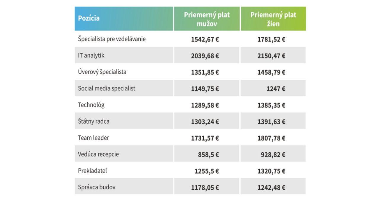 „Trh práce je rozmanitý a takisto sú rôzne aj výšky zárobkov naprieč pozíciami. Kým generálny riaditeľ dokáže zarobiť mesačne napríklad 5 000 € a IT špecialista 2 500 €, zdravotná asistentka si v priemere na účet pripíše 750 € a HR asistentka 1 000 €, existujú teda pomerne vysoké rozdiely naprieč jednotlivými pozíciami,“ informuje portál Platy.sk.