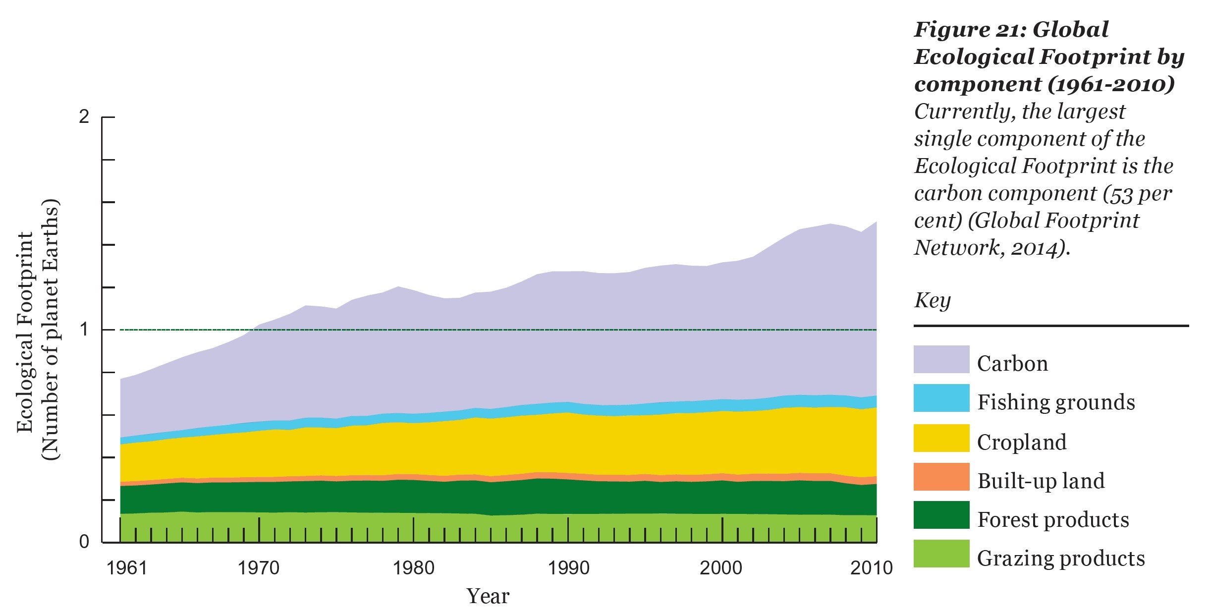 GFN vysvetľuje vo svojom vyhlásení, že ľudstvo vypúšťa viac oxidu uhličitého do atmosféry než naše oceány a lesy dokážu absorbovať. Tým poškodzujeme rybolov, kácame lesy rýchlejšie ako sa stihnú regenerovať.